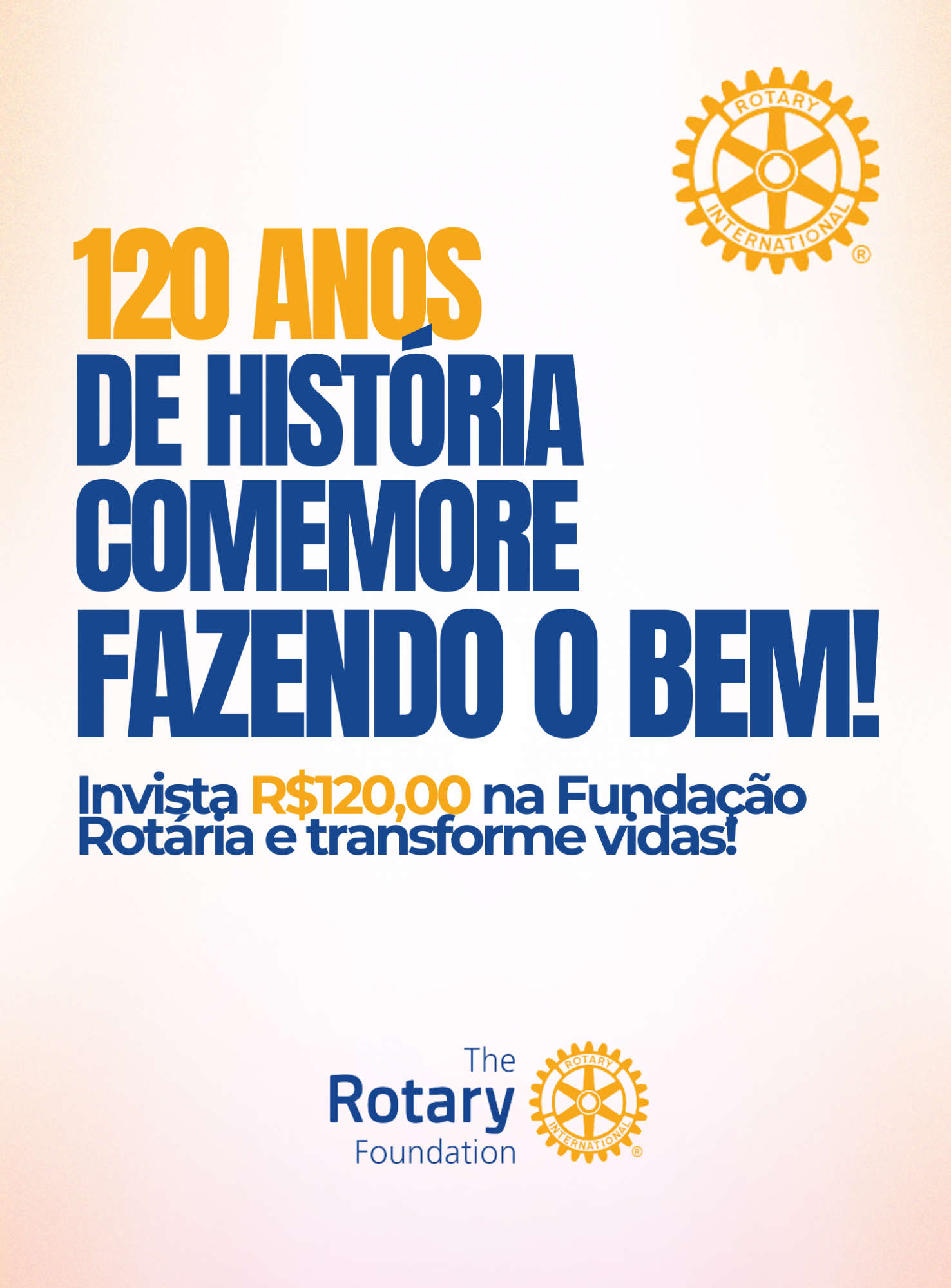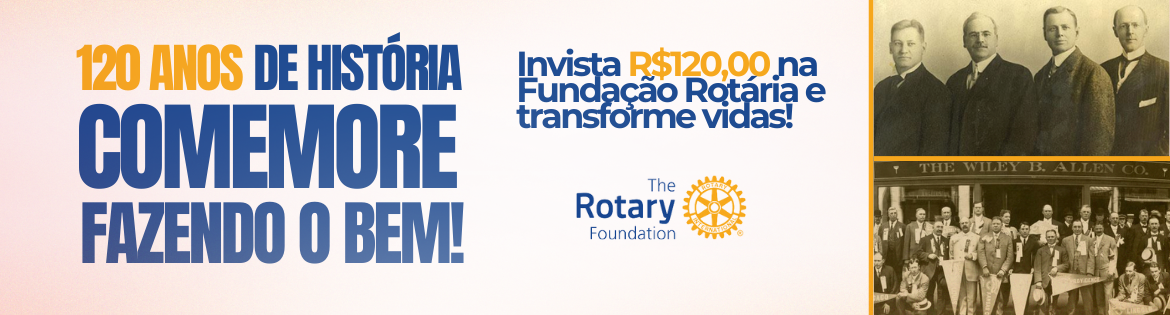 No mês de fevereiro, o Rotary International está celebrando 120 anos de prestação de serviços e dedicação à construção de um mundo melhor. Para marcar esta data especial, a Fundação Rotária convida você a se juntar à campanha "120 Anos de História, Comemore Fazendo o Bem!".